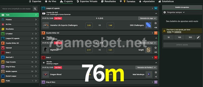 O 76m oferece uma grande seleção de opções de apostas em e-sports com probabilidades competitivas